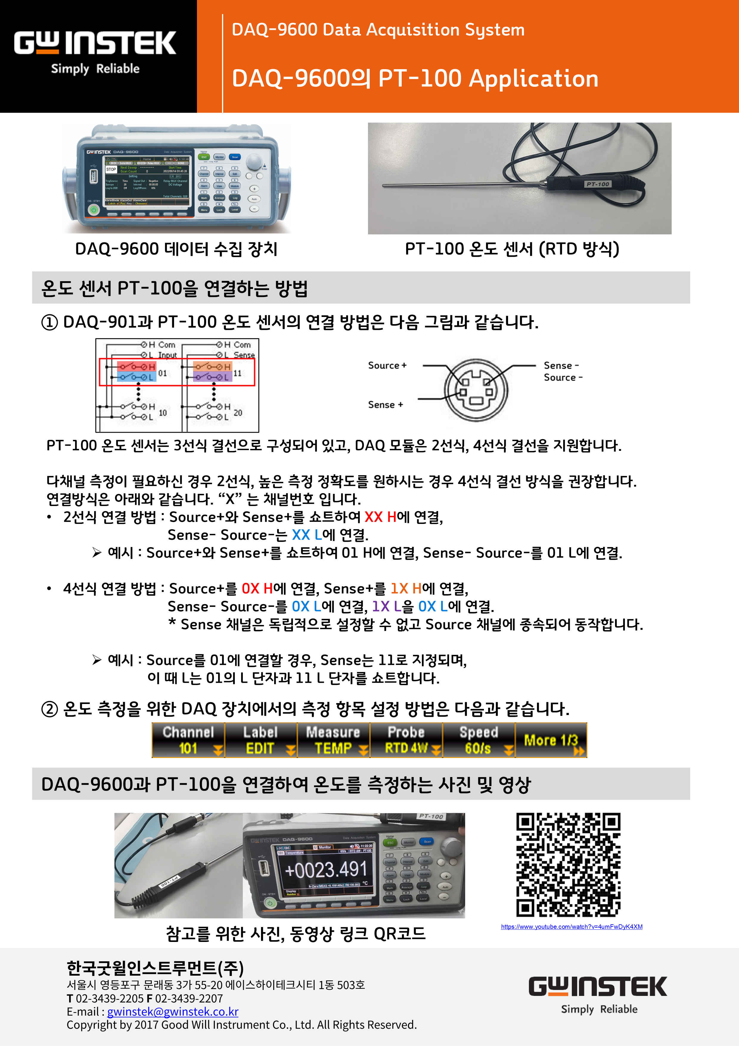 DAQ-9600과 PT-100을 연결하여 온도를 측정하고, PC 소프트웨어 DAQ-Data Logger를 이용하여 그래프를 표시하는 영상은 링크를 이용해 주세요.