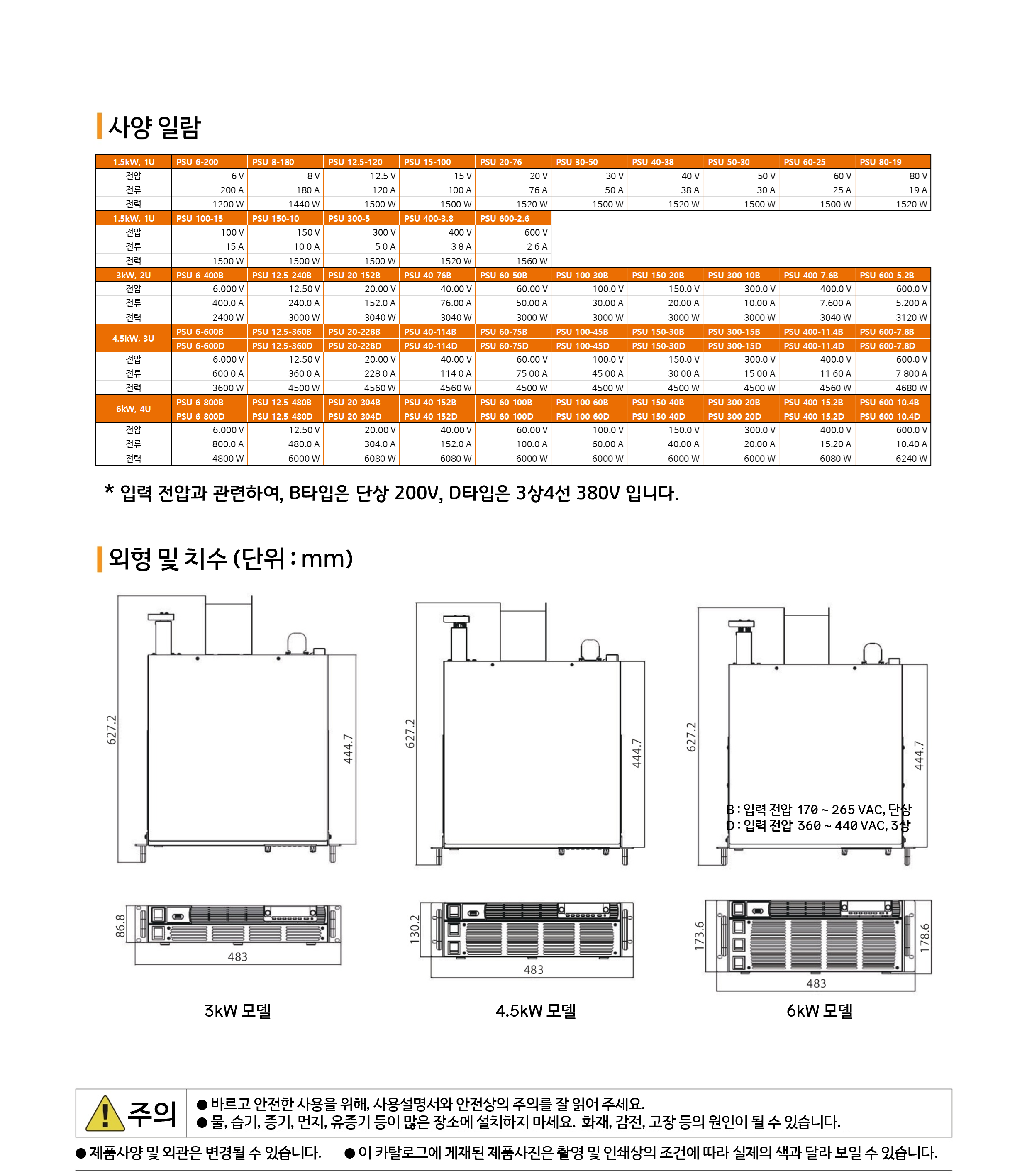 * 입력 전압과 관련하여, B타입은 단상 200V, D타입은 3상4선 380V 입니다. |